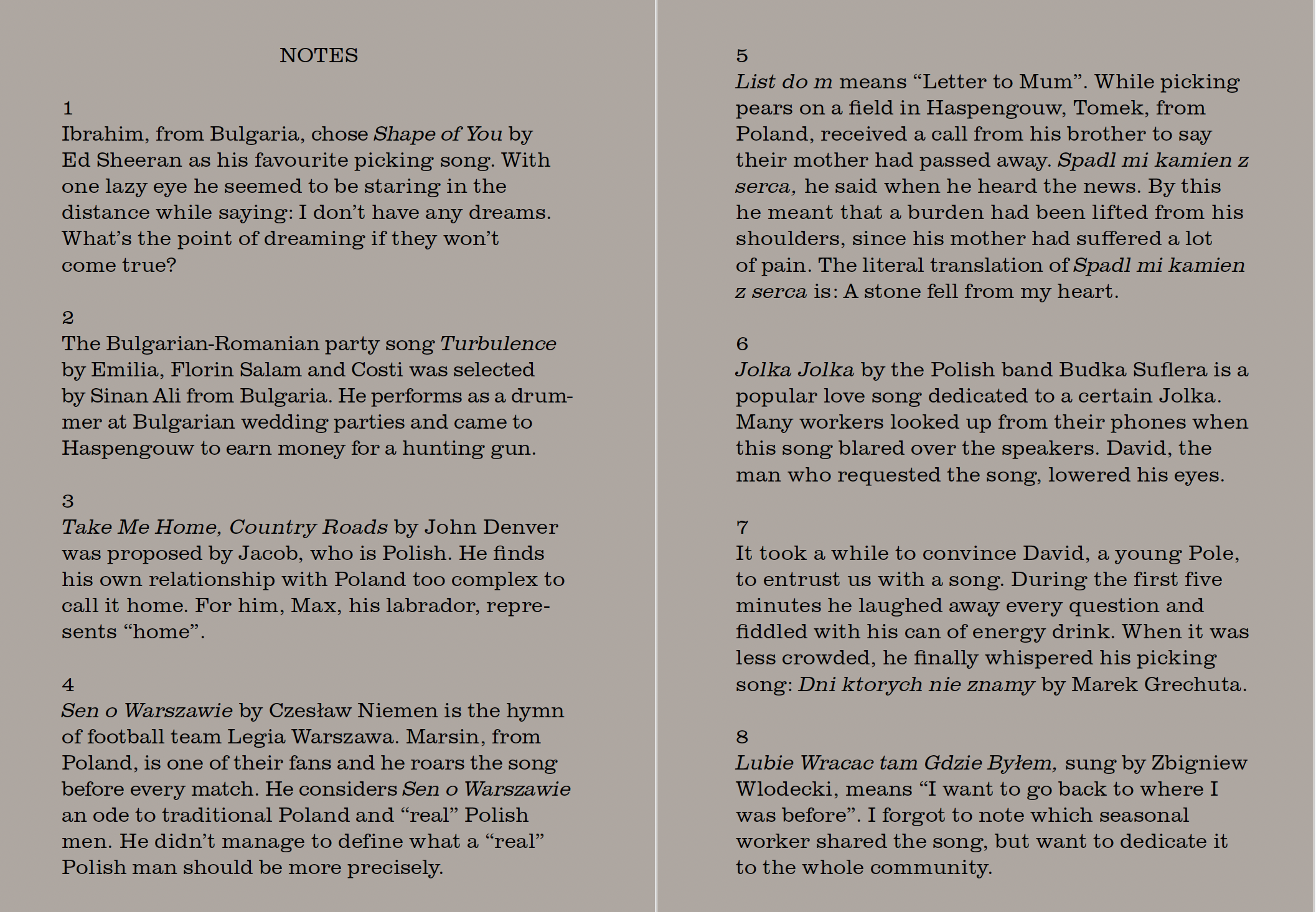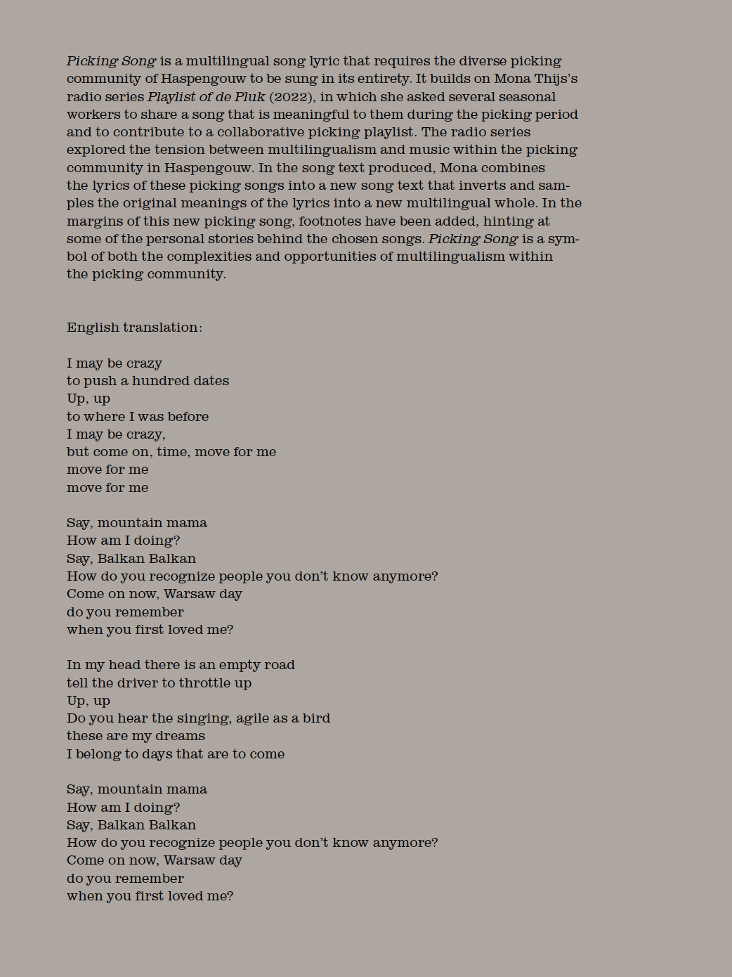 In samenwerking met woordkunstenares Mona Thijs worden er reflecties en vertalingen binnengebracht van enkele van de liedteksten, zodat ook de transnationale leefwereld van de seizoenarbeiders die in de buurt wonen erin te herkennen valt. Daarenboven zet Stijn het “Pluklied” op muziek. Deze tekst ontstond uit Mona’s eerdere project “Playlist van de pluk”.