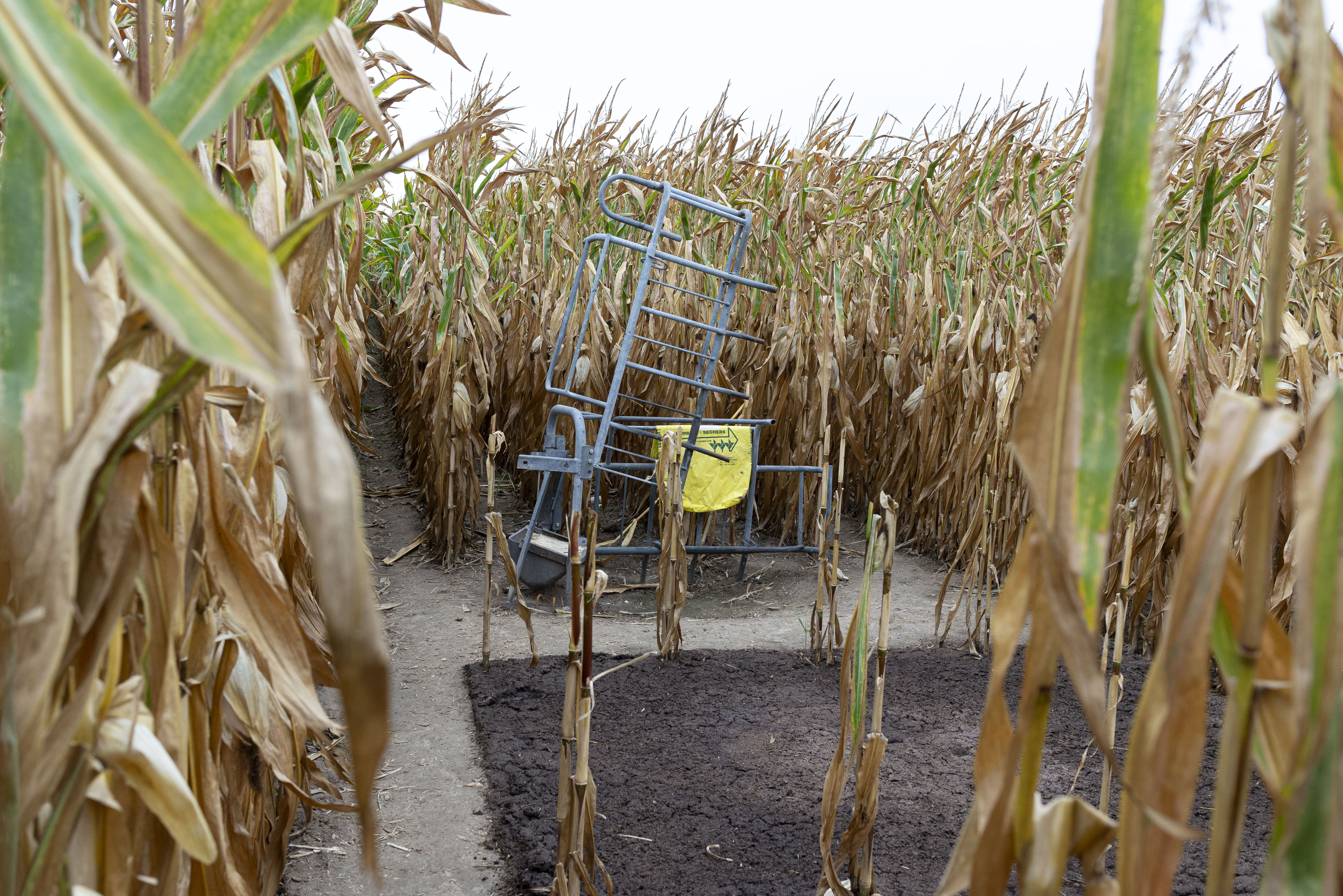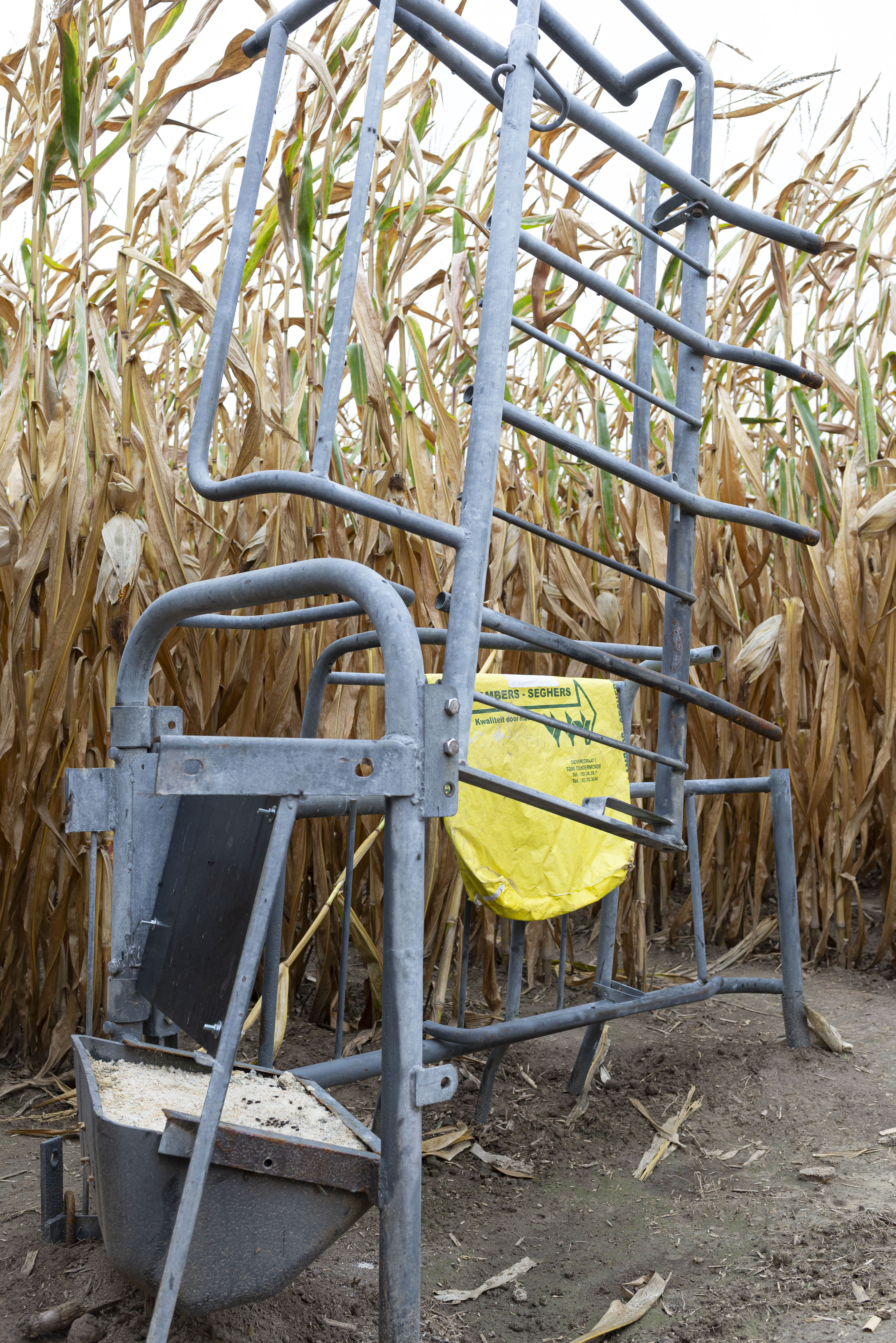 Pigs, although invisible in the fields of Zwalm, are strong architects of the landscape: their manure fertilizes the fields, and the maize is grown to feed them. Even on farms, they keep trying to build: when the time comes for them to give birth, they look for material to build nests. Documentary traces left in the maize field invite acknowledgement of their presence, their role, and their needs in shaping the landscape.
